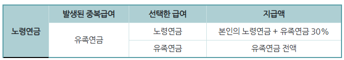 자신의 노령연금을 선택하는 경우, 자신의 노령연금과 사망한 배우자 유족연금의 30%를 추가로 받게 됩니다. 아니면 유족연금을 선택하는 경우에는 유족연금액만을 받게됩니다.