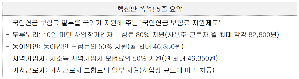 저소득층, 지역가입자, 농어업인, 10인 미만 사업자가입자 등을 대상으로 국민연금 보험료 일부를 국가가 지원해 주는 제도입니다. 각 유형별로 지원 대상 및 지원 내용을 확인해보시고 해당하시는 분들은 신청해보시기 바랍니다.
